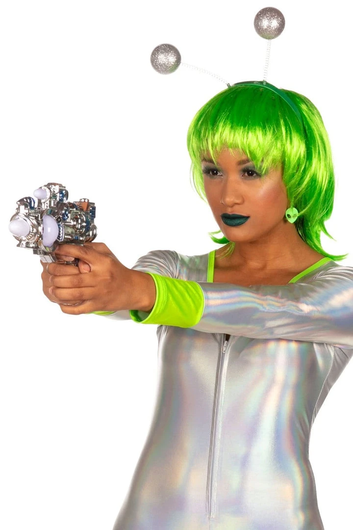 Need a Halloween costume that’s totally out of this world? We hear ya. That’s why we’ve created this Women’s Alien costume, making you look straight-up intergalactic fantastic. Make your entrance in your spaceship and dazzle your fellow party goers with this uber neon, reflective one-piece. It’s part extra-terrestrial, part disco, and full funky. With bright green sleeves and collars, you’ll stand out among the ghouls and zombies. They might be from another planet, but you’re from a whole different galaxy, honey. Having a bad hair day? Fret not, little Area 51 dweller – you can cover it all up with the green wig and antennae. It’s all included, and no alien would leave the space station without it. Feel free to add your own finishing touches from our accessories collection, like disco ball earrings to liven up the party! Who knew aliens had such awesome moves? Beam yourself up to dance floor queen status.