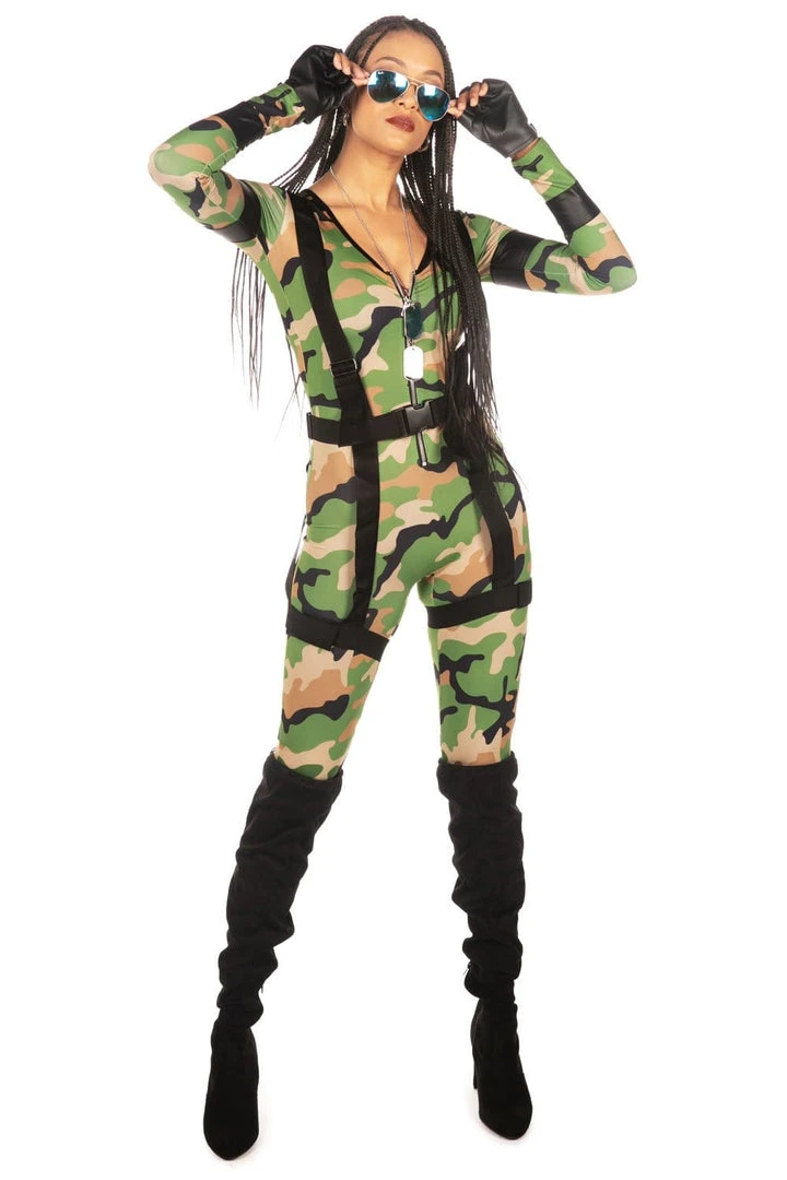 Ladies, it’s time to outrank all your fellow Halloween party guests with this funky women’s army costume. Though you’ll be dressed head to toe in sexy camouflage, there’s no way you’ll blend in with this camo costume! The army costume comes with a seductive and practical pair of utility braces, perfect for storing keys, cell phones, grenades – whatever works. It’s also got a convenient front zipper so you can determine just how risque you want your army costume to be. Only the highest ranking officers qualify for this jaw-dropping uniform. If you’re so much as approached by anybody lower than a general, you have full permission to make them drop and give you 20. Our snug fitting army costume allows for plenty of movement if you want to shake your brigadier booty on the dance floor. Accessorize this bodysuit with a pair of sexy army boots and show them who’s boss.