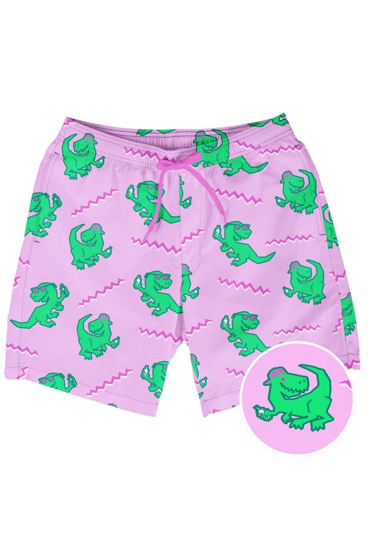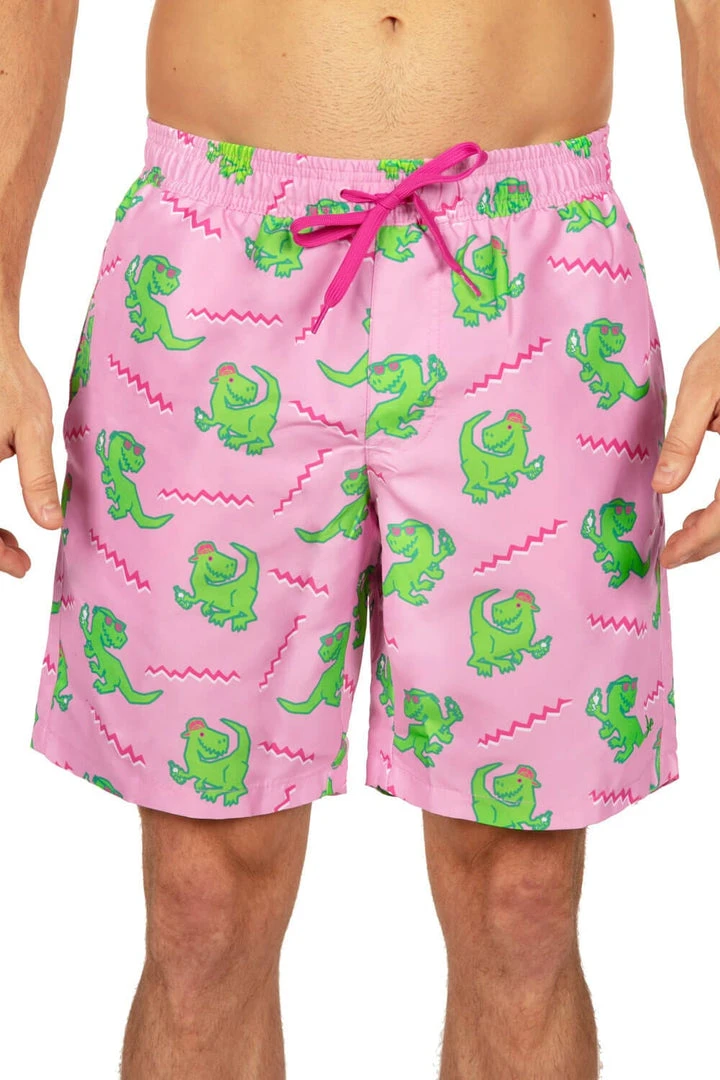 Who said disco was dead? Because it’s extinct, actually. You can be the one rad dinosaur left who’s keeping the dream alive in the Men’s Dino Disco Swim Trunks. These pink beauties with party dinos all over make the dance floor your stomping ground. They’re perfect for the sweet backflips in the pool that you’re known for. A comfy waistband with drawstring keeps your disco balls from making an appearance, and the length is just enough to give everyone Saturday Night Fever. On Sunday, no less. Slip into these and keep the dream staying alive. Staying Alive. Ah ha ha ha. Staying Alive.