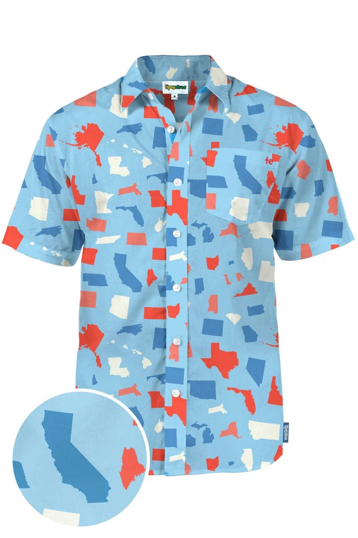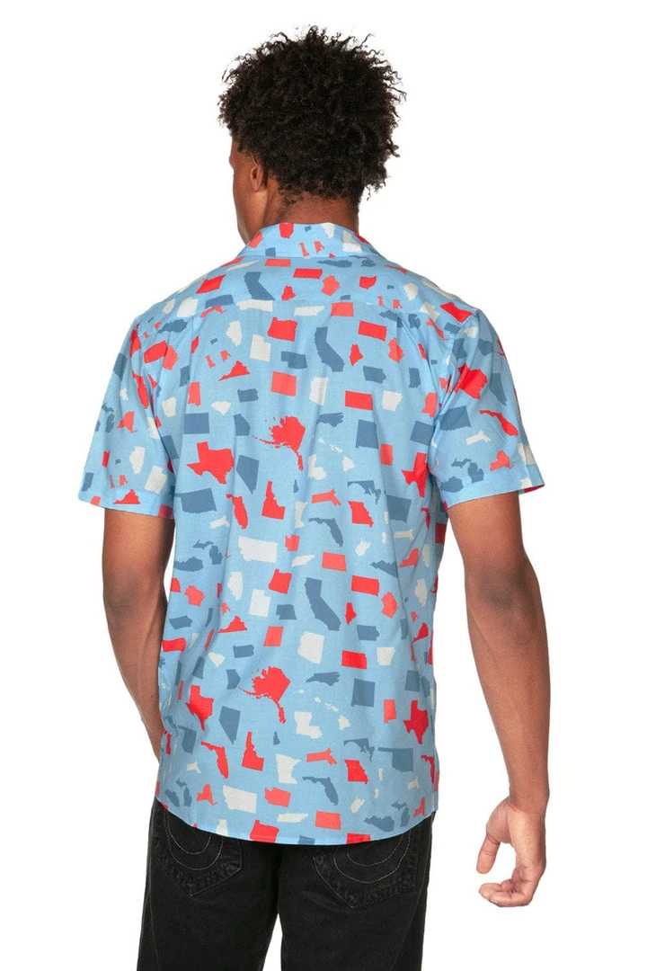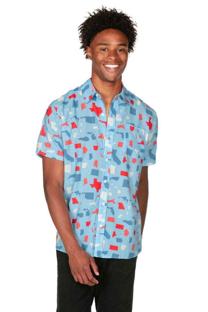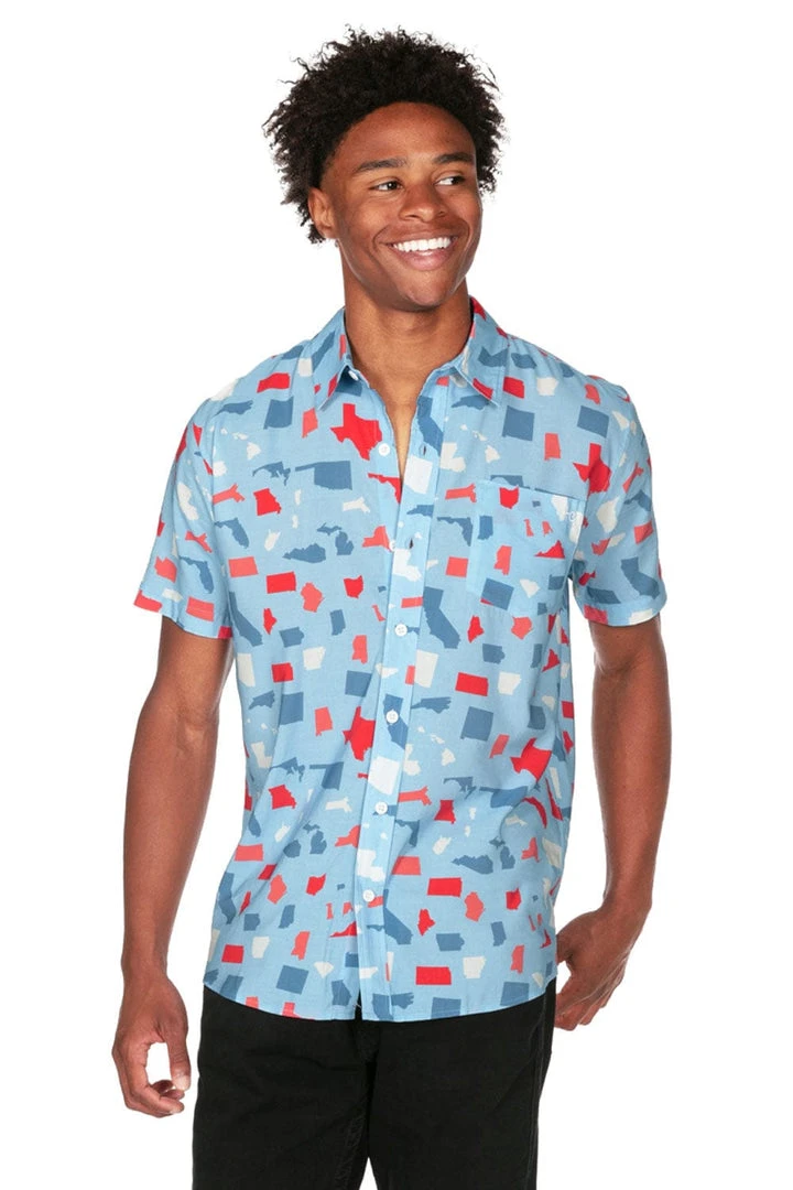 Close your eyes and think. Can you honestly name all 50 states? Even the Dakotas? Make the annual challenge yours with our Men’s All Around the USA button down shirt. This one-piece will liven up Independence Day celebrations as you pick out your favorite states – if you can find them.