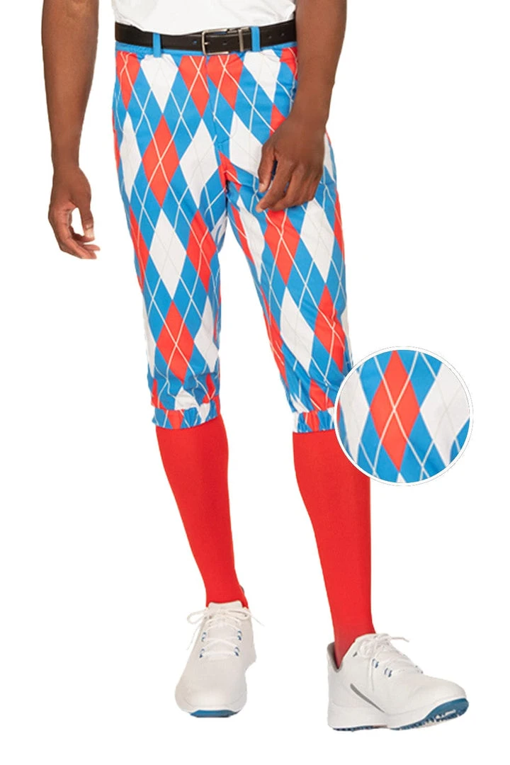 Argyle is a Scottish pattern, and golf is a Scottish sport. But the design on these knickers is 100% American. Step up to that ninth hole with confidence in these comfortable US themed golf pants. With those bright red socks and spiffy white shoes, we’re willing to bet your style handicap just went way down. Red golf socks are included!