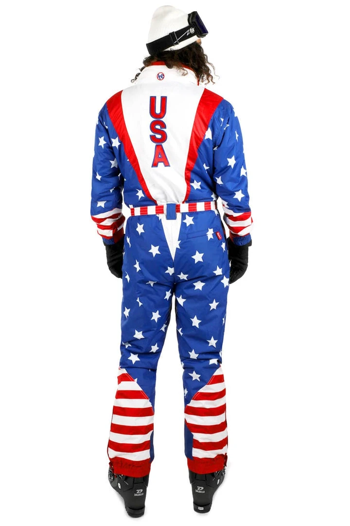 No matter where you may roam in this ski suit, everyone on the slopes will know you are a big fan of the red, white, and blue. In fact, you and your fellow patriots can give each other air high fives on the ski lift. Scratch that. You won’t be riding up any stinkin’ lift. Real Americans walk up the mountain! Excelsior!