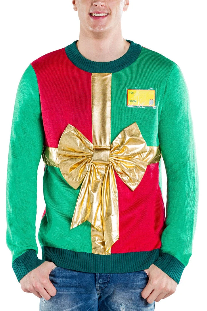 Wrap yourself up with this awesome Christmas present sweater and become a gift to the world. This sweater rocks the classic Christmas colors, red and green, for the wrapping paper and is tied all around with some gold ribbon. It even has a place to write who this awesome gift is for and who it is from. Do not shake this present as it may cause damage.