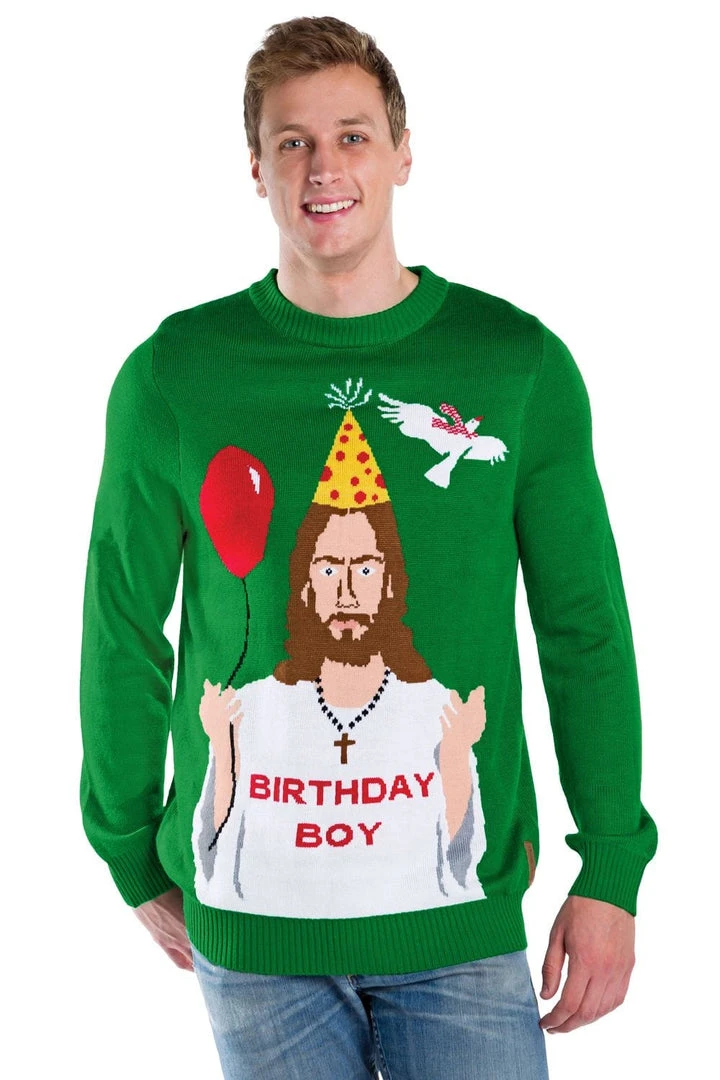 If He’s the reason for the season, it’s time to celebrate! This Christmas sweater features the Son of God himself, complete with a party balloon. A festive white dove with a red ribbon around its neck soars above, while the Birthday Boy stares solemnly from underneath a rakish party hat. This Christmas sweater has a solid green background.