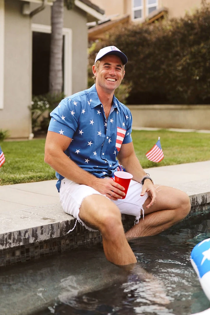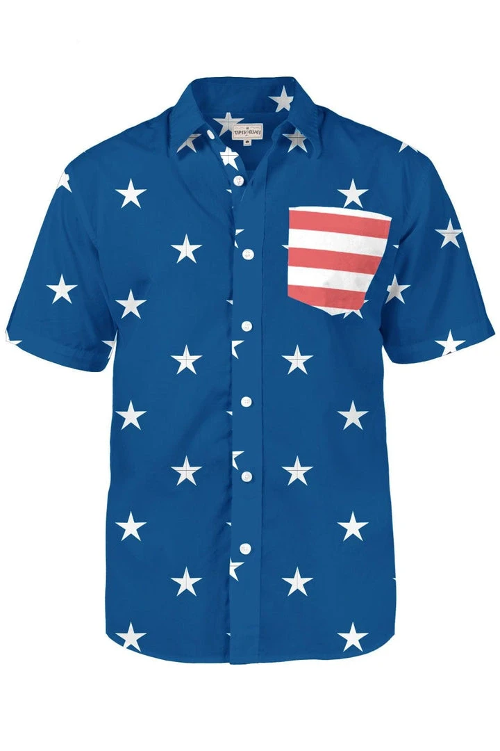 Gentlemen – are you in search of something more sophisticated this Fourth of July? Skip the tuxedo and go for something patriotic and classy with our Men’s Old Glory Hawaiian Shirt. This dark blue homage to the star spangled banner keeps it classy with a striped pocket and stars all over your torso. Button it up and make your way to the front of the barbecue line.