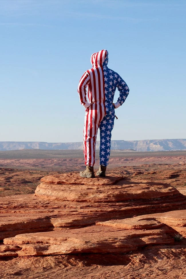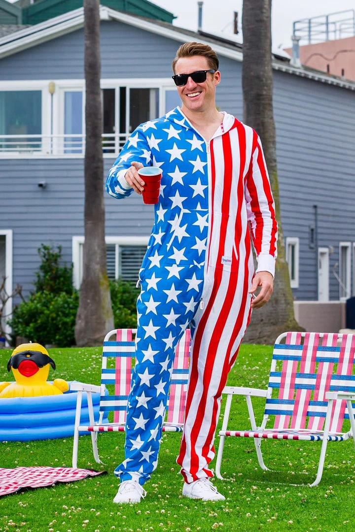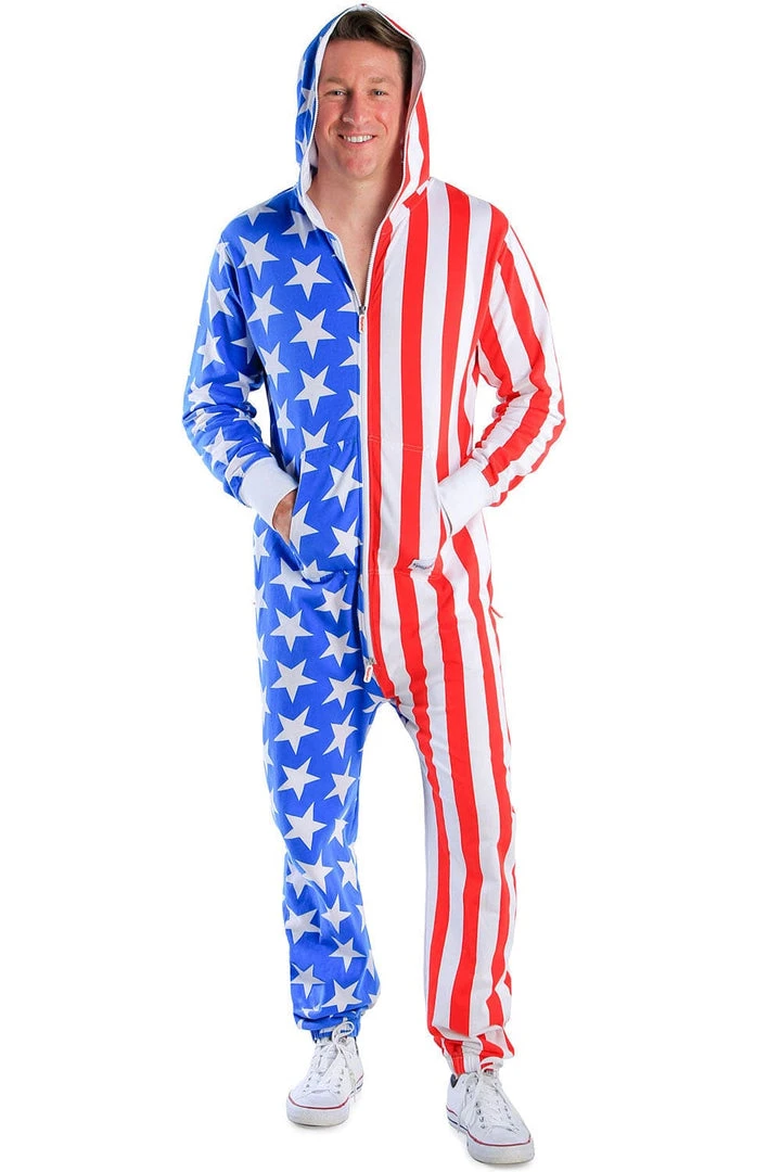 It’s got a zipper. It’s got a hood. It’s Red, White and Blue with Stars & Stripes and it smells of freedom. In short, it’s got everything you need and then some. This American Flag jumpsuit is the best thing since the United States was founded! This American Flag jumpsuit will make you the most comfortable patriot of all-time as freedom has never looked this good!