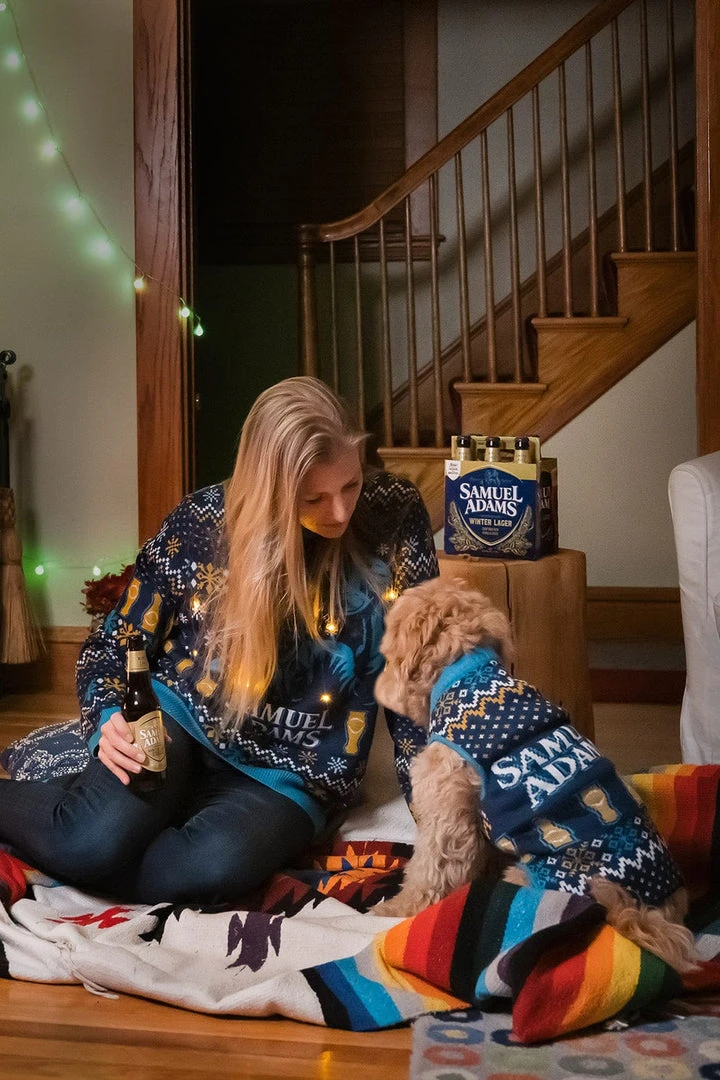 He sees you when you’re sleeping, he knows when you’re awake. No, not the gift giver – your dog. Your dog sees everything, including those weekday beers you promised you would be drinking less of. It’s time to make them more supportive, and our Sam Adams Dog Sweater gets them in on the fun! With a dark blue knit and a snowflake print reminiscent of the perfect snowfall, your furry friend will know it’s soon time for a chilly w-a-l-k. With his natural and man-made winter coat, nothing stands between them and their leash! Who’s Sam Adams, anyway? Hope he brought treats.