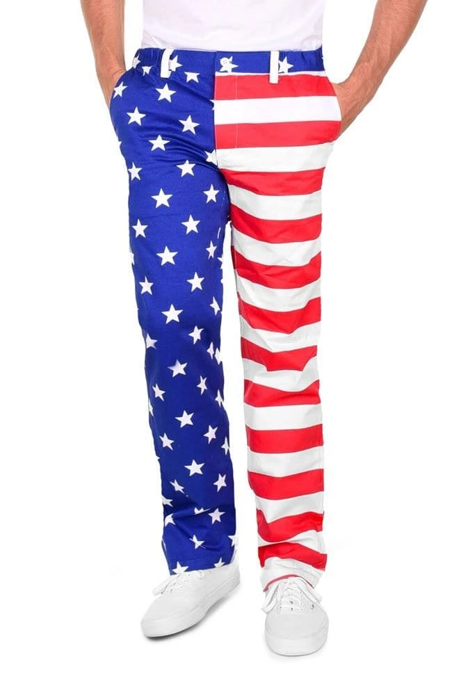 The images of Uncle Sam on recruiting posters only show his top half (with the fancy hat and jacket). If you’ve ever wondered what he wears for trousers, we’ve got the answer to that question. He has on a pair of Tipsy Elves American flag pants. These boldly patterned pantaloons feature stripes in red and white down one side and white stars on a blue backdrop on the other. These are great pants to wear to a themed costume party, a Fourth of July barbecue, or a Memorial Day tailgating event. The chino fabric is comfortable and flexible and easy to wash and wear.