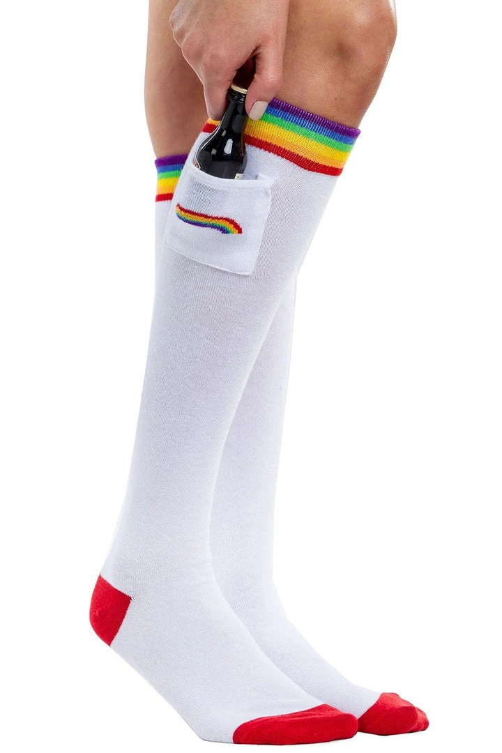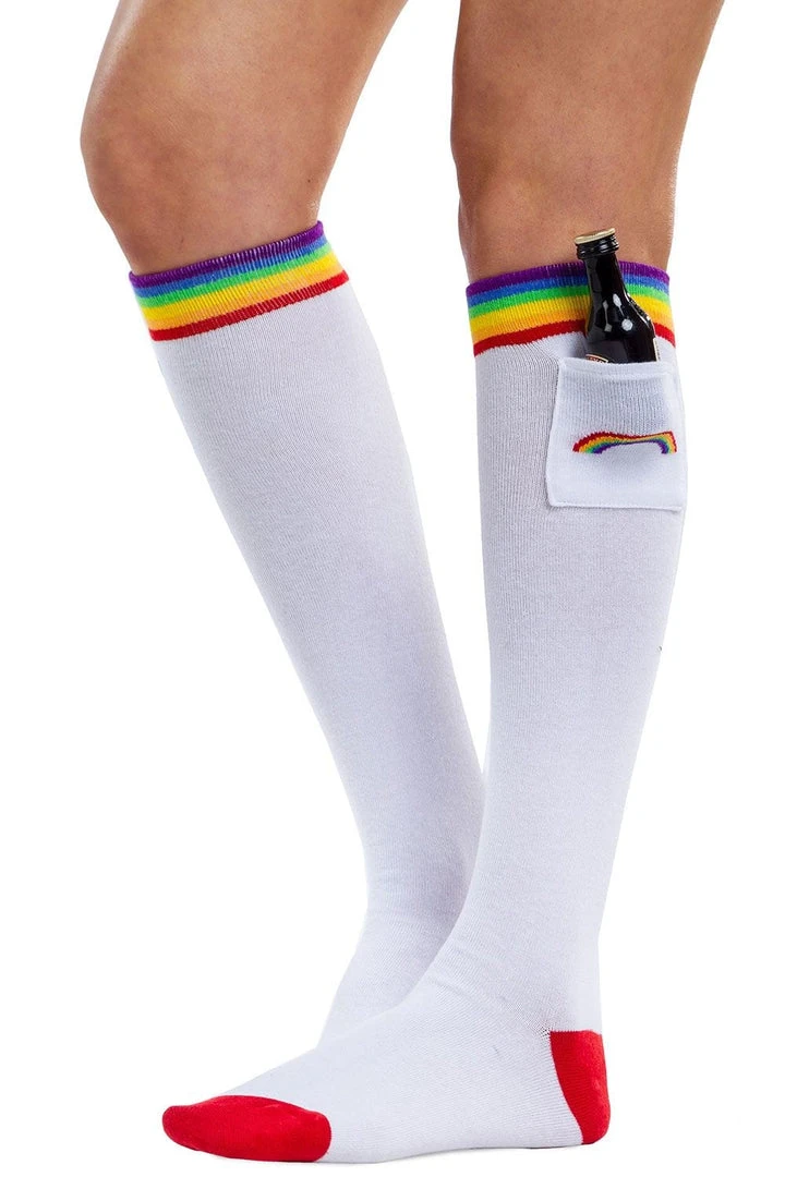 Do you believe in the pot of gold at the end of the rainbow? After enough St. Patrick’s Day whiskeys, you’ll probably believe anything, so showcase your Irish spirit with these Women’s White Rainbow Socks with Pockets. These plain white knee highs have just a dash of magic at the knee, ideal for pairing with an emerald green skirt on those pub crawls. If you’re a drink spiller though, best to wear them with pants.