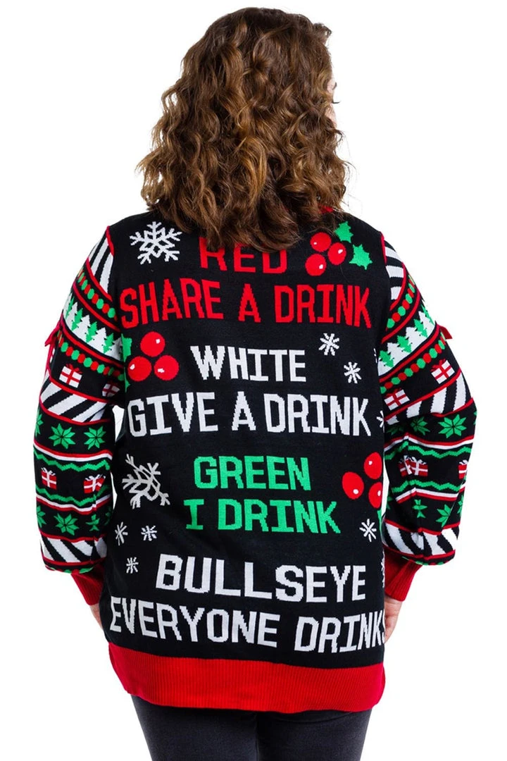 You miss, you drink! That’s a pretty simple set of rules, right? We’re here to liven up any boring Christmas parties you might be subjected to this year. Introducing the Women’s Drinking Game plus size ugly Christmas sweater. All you have to do is pull on this snuggly sweater and brace yourself. You buddies can throw the soft balls at the target, and whoever misses, drinks! Save this one for office parties – probably safer to break the photocopier than Mom’s good china. With festive colors and a healthy dose of irresponsible drinking, this is both stylish and good old-fashioned fun.