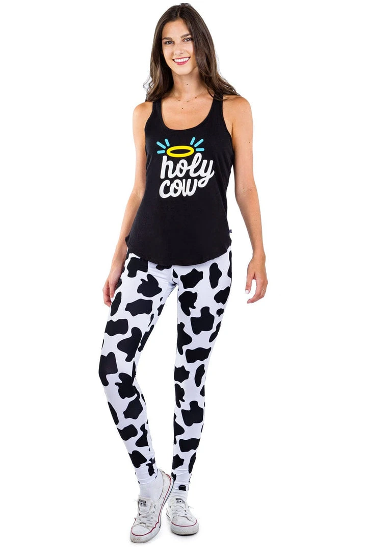 Struggling to find the perfect Halloween costume this year? Don’t have a cow, man – throw on our women’s cow shirt instead! It may not exactly be sprouting udders, but this tongue in cheek cow shirt takes the best of our favorite childhood slogans and sticks them on an animal print shirt. Complete with a charming halo motif, this holy cow shirt is guaranteed to get the laughs when you need them most – whether it’s trick or treating with the little ones or cheering yourself up with one of those famous Halloween hangovers. The wonderful thing about the holy cow tank top is its versatility – while it makes for a great low-key Halloween costume, it also wouldn’t look out of place at the grocery store. Whatever month we’re in, if you really want to be a bovine beauty, pair it with our women’s cow leggings and call yourself Daisy. Udders optional.