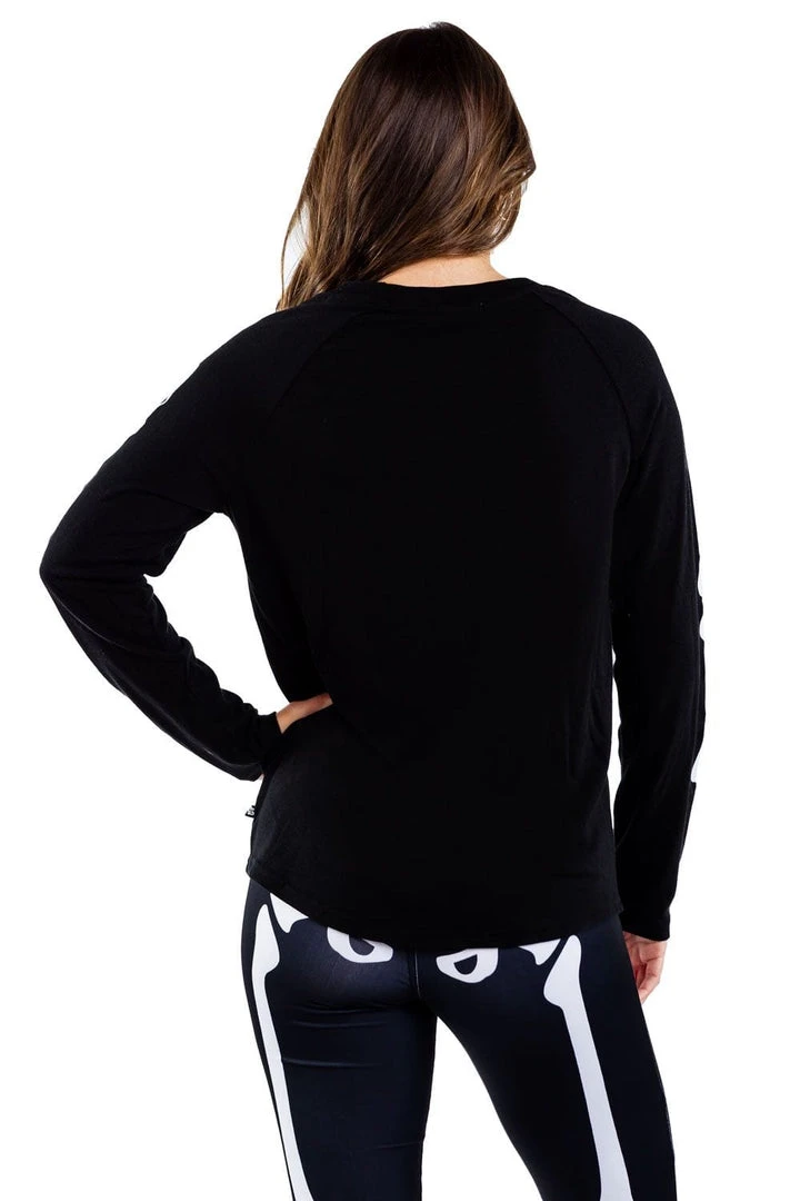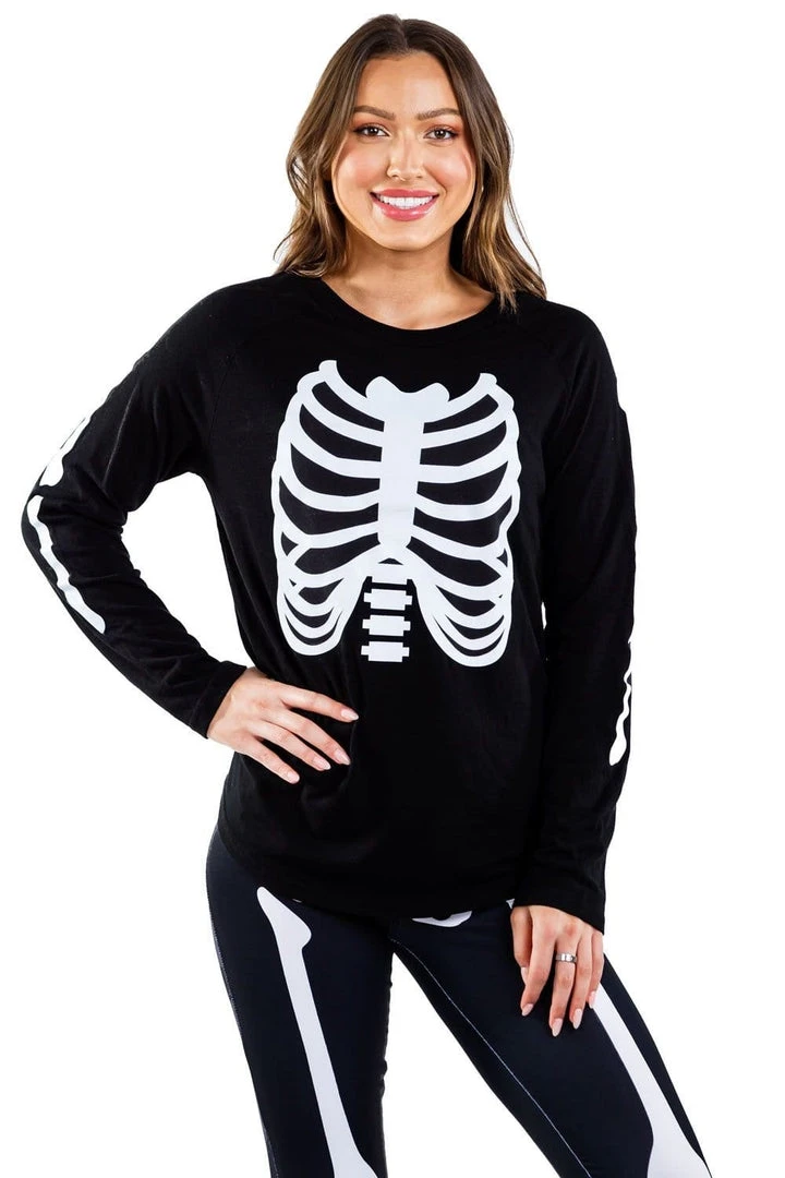 Got a work do, or just no time to go full costume? We hear ya. Fake blood is a pain in the ass to get out of clothes, so if you’re looking for something more casual, try our women’s long sleeve skeleton shirt. It’s got all the key bones of the upper torso, with none of the lower body awkwardness. Great if you don’t want your boss’ eyes to accidentally meet your pelvis. You can pair this with jeans for an informal office celebration, or just lounge around the house. It’ll show the kids next door that you made the effort, and you don’t even need to carve a pumpkin. Shazam. This super comfortable long-sleeved shirt will keep you toasty on cool October nights, and could even make a great pajama top. Skeletons never go out of style, so you can recycle this look every year in one easy click.