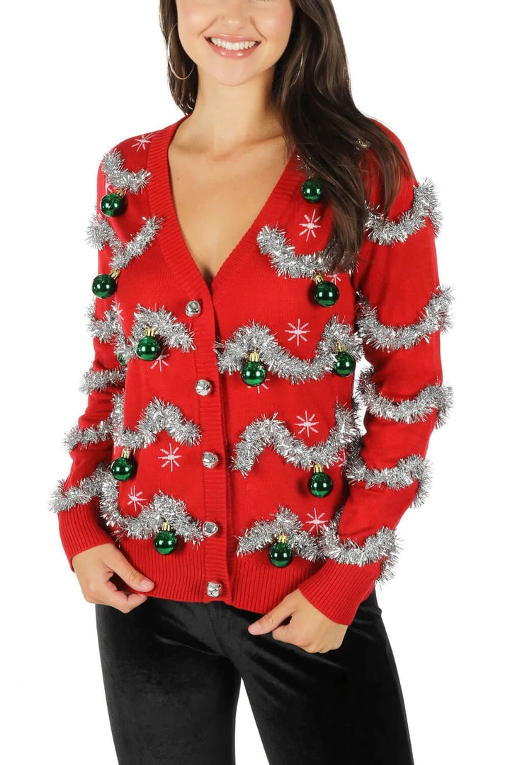 This classic cardigan sweater is embellished with actual garland and real ornaments, helping to put a little more ‘jingle’ in your day. Thankfully, there aren’t any hooks involved with the ornaments as that might put quite a damper on your Christmas cheer. This Women’s Tinsel Christmas cardigan is so authentic, you shouldn’t be surprised if people are constantly putting gifts at your feet and singing “O Christmas Tree” around you.